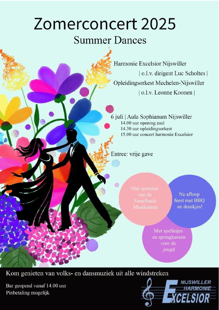 Op zondag 6 juli a.s. houdt Harmonie Excelsior haar inmiddels traditionele zomerconcert als afsluiting van het muzikale jaar. Dit jaar met als thema “Summer Dances” waarbij wij een pallet aan diverse muzikale klanken ten gehore zullen brengen, van traditionele volksdansen tot moderne werken. Wij starten om 14:00 uur met het opleidingsorkest waar onze nieuwe sterren van zich laten horen waarna de harmonie speelt. Na de concerten is er ook voor spijs en drank gezorgd onder de muzikale klanken van de Sinselbach Musikanten. Ook aan de kinderen is gedacht en is er weer een springkussen aanwezig. Wij nodigen iedereen van harte uit om samen met ons de zomervakantie in te luiden, wellicht de laatste keer het zomerfeest in de aula van het Sophianum (de auw LTS).